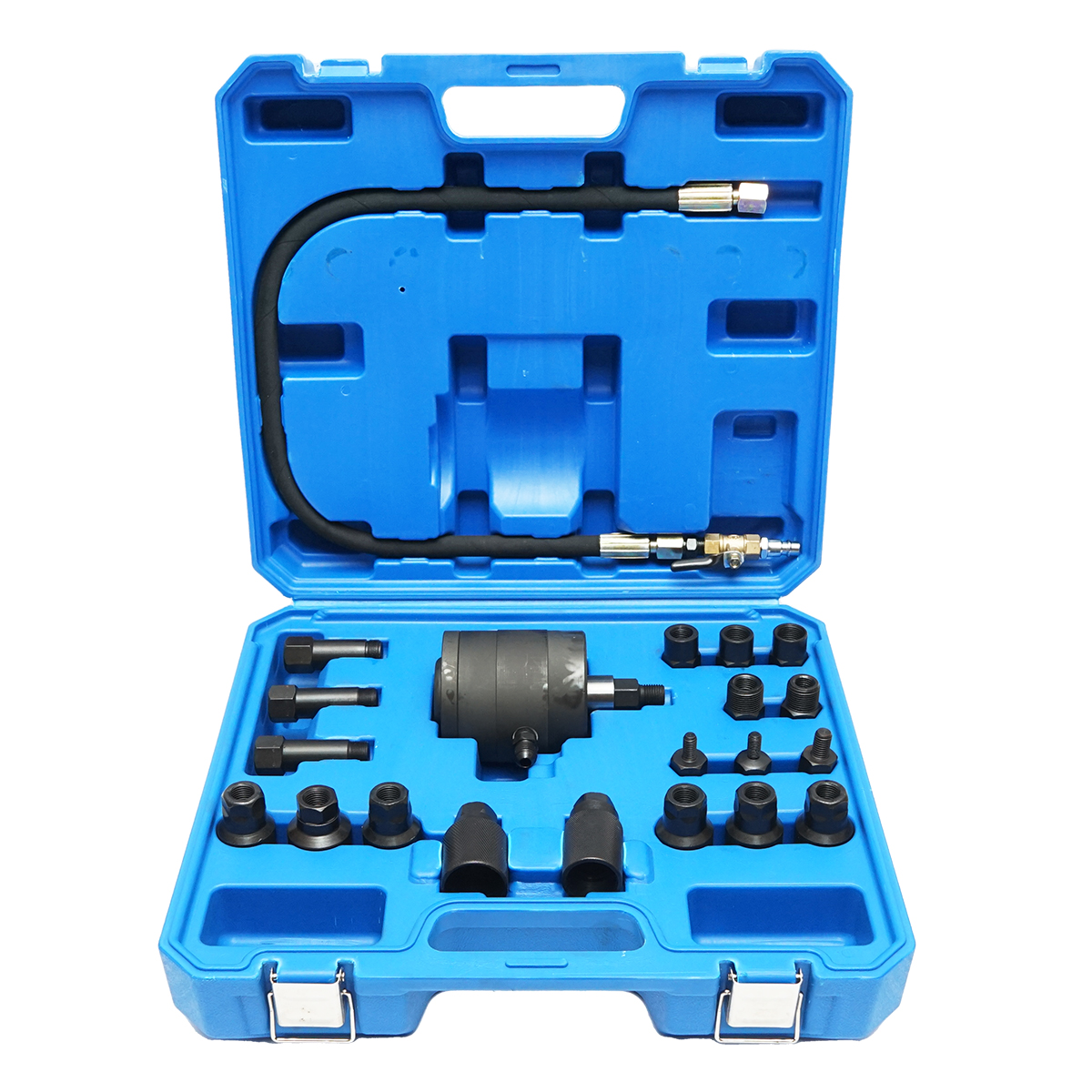 Trusa este un set ideal pentru extragerea injectoarelor gripate, care utilizează aer comprimat și un mecanism cu ciocan pentru a oferi performanțe superioare. Cu ajutorul vibrațiilor de înaltă frecvență și a forței de impact, acest dispozitiv asigură o eficiență ridicată în îndepărtarea injectoarelor gripate, facilitând astfel munca și economisind timpul dumneavoastră.